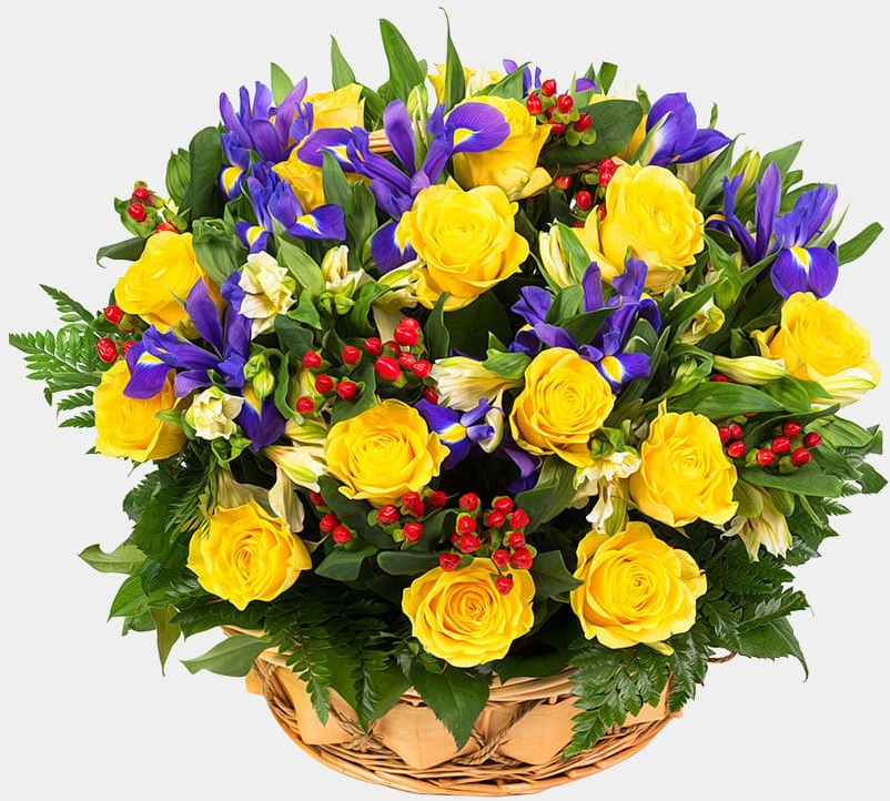 19 роз, 11 ирисов, 11 альстромерий, 7 гиперикума, салал, папоротник, оазис, корзина23 розы, 15 ирисов, 15 альстромерий, 10 гиперикума, салал, папоротник, оазис, корзина